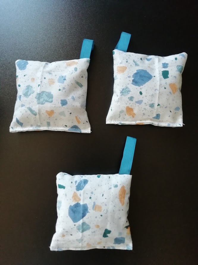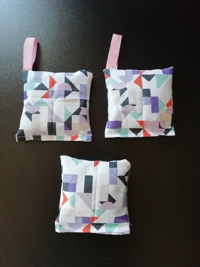 J’ai réalisé des petits carrés de lavande d’environ 10 cm / 10 cm avec des chutes de tissus. J’ai cousu ces carrés à la machine à coudre, rempli de lavande du jardin et sur certains j’ai fait une petite attache.