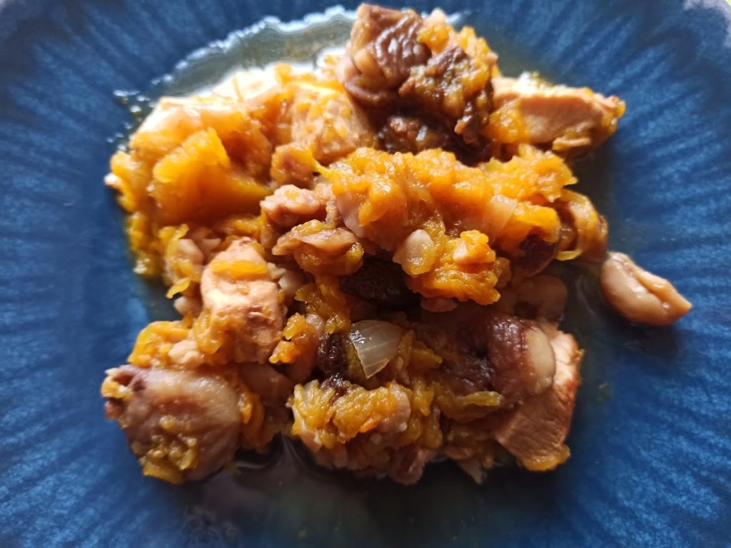 Dans la cuve du Cookéo que l’on aura mis en mode doré , verser 1 c à s d’huile d’olive ,1 oignon émincé, 1 escalope de dinde épaisse coupée en morceaux . Mélanger de temps en temps. A la sonnerie ajouter 10 pruneaux dénoyautés , du potiron, des marrons sous vide et 200 ml de bouillon de volaille. Programmer l’appareil en mode cuisson sous pression 15 minutes.