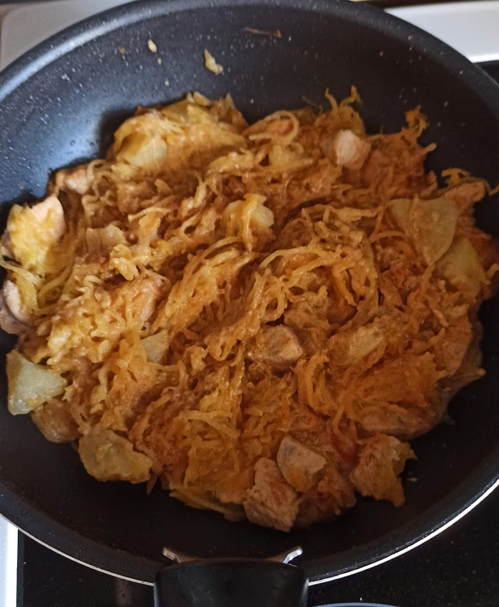 Dans le Cookéo mettre le panier vapeur avec une demi courge spaghetti , 2 pomme de terre coupées en morceaux et ajouter 200 ml d’eau . Programmer l’appareil 10 minutes . A la sonnerie laisser refroidir. Dans un wok mettre 2 c à s d’huile d’olive , du sauté de dinde faire revenir de tous les côtés . Ajouter les pommes de terre cuites , ainsi que l’intérieur de la courge spaghetti , 10 cl de crème liquide , 1 bonne c à c de paprika . Laisser mijoter quelques minutes en remuant . C’est prêt servir.