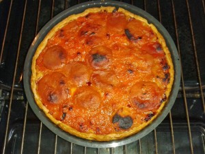 Dans un wok mettre 1 cuillère à soupe d’huile d’olive , 1 cuillère à soupe de moutarde ancienne , 2 petites échalotes ciselées , 1 cuillère à soupe de vinaigre balsamique , sel , poivre , 800 g de tomates cerises.Faire revenir le tout 10 min a petit feu en tournant délicatement . Puis prendre un moule à tarte parsemer dans le fond des lanières de jambon sec .Disposer par-dessus la préparation précédente ,puis recouvrir d’une pâte brisée.Mettre dans un four chaud à 200° pendant 30 min environ.