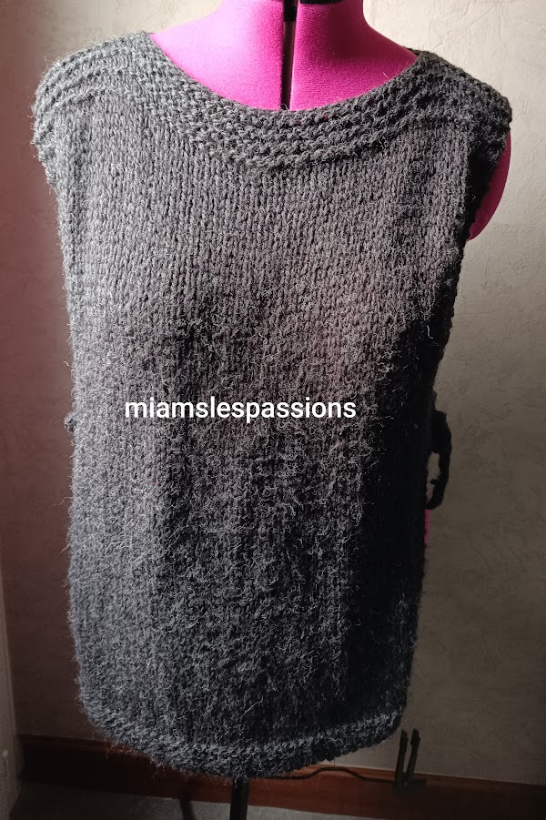 J’ai monté 2 rectangles identiques de 55 mailles avec des aiguilles 10 . J’ai fait une hauteur de 60 cm. Ensuite j’ai cousu les épaules . Sur le côté j’ai tricoté 4 i-cord ici avec des mailles que j’ai relevé sur le côté du pull.