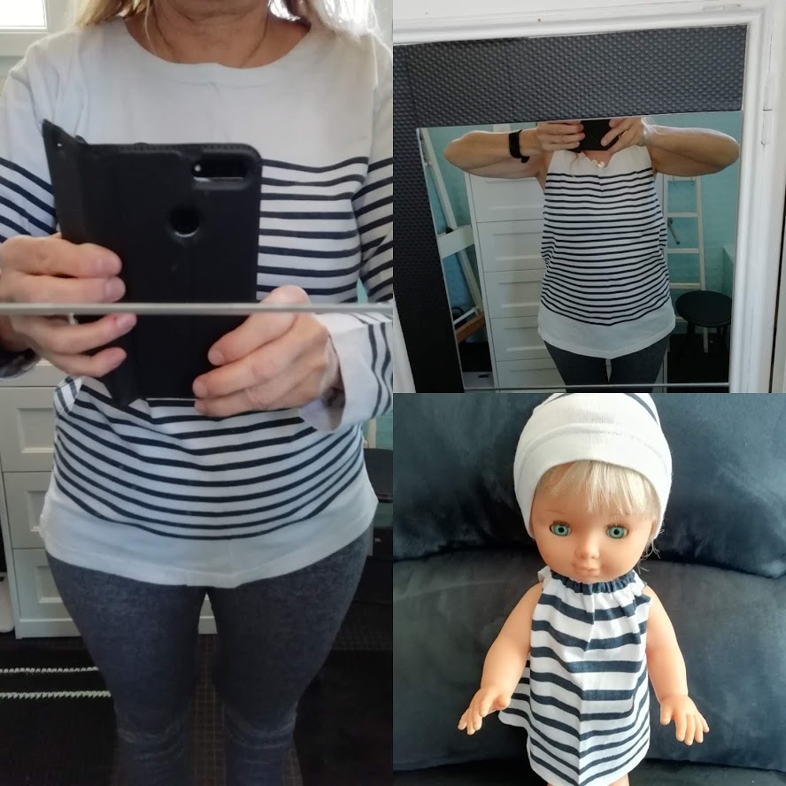 Transformation d’un t-shirt marin à manches longues en débardeur avec comme accompagnement une petite robe et bonnet pour une poupée.