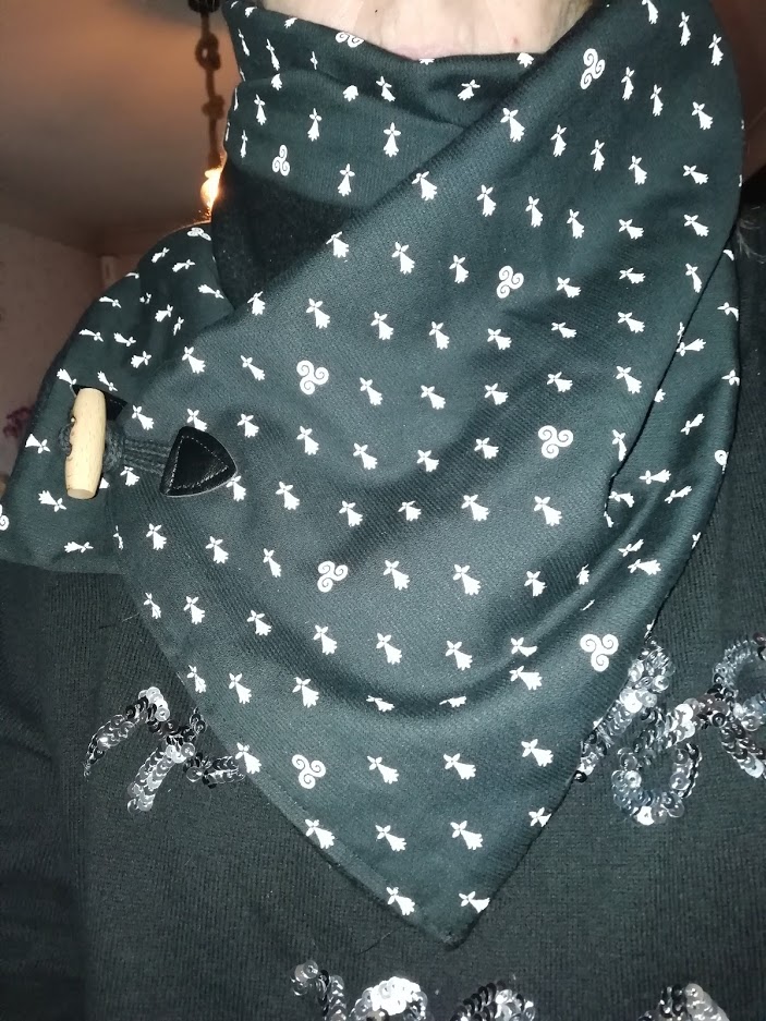 Découper 2 rectangles de 92 cm / 30 cm . Un rectangle dans du tissu polaire et un autre dans un tissu imprimé. Coudre à la machine. Mettre l’attache à 22 cm et le bouton au bord à l’opposé .