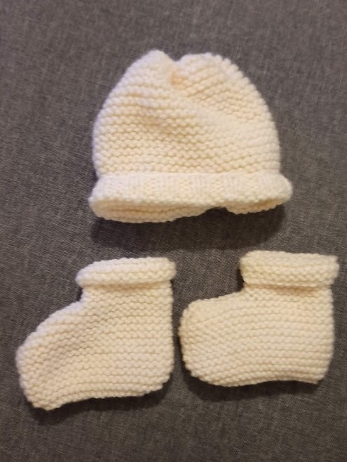 Voici un bonnet ainsi que des chaussons tricotés au point mousse tout simple.
