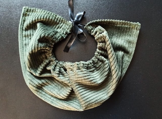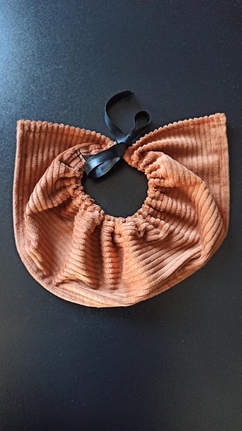 Voici des petites collerettes amovibles réalisée dans un tissu velours côtelé. Pour réaliser celle-ci j’ai fait un rectangle de 70 cm sur 10 cm en ajoutant 5 cm pour les ourlets . J’ai fait un ourlet tout autour et dans l’un des ourlets de la longueur j’ai passé un ruban de 90 cm.