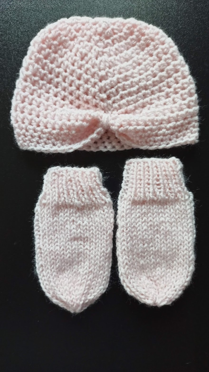 Voici un petit ensemble bonnet réalisé au crochet et gants tricotés avec une aiguille circulaire.
