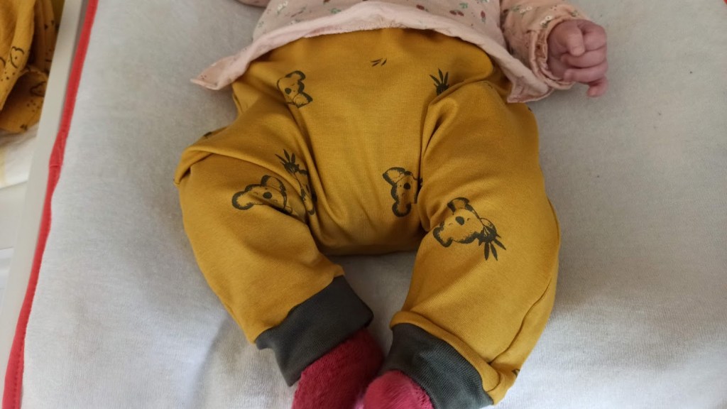 J’ai réalisé ce petit sarouel taille 6 mois à la surjeteuse , pour ma petite fille .