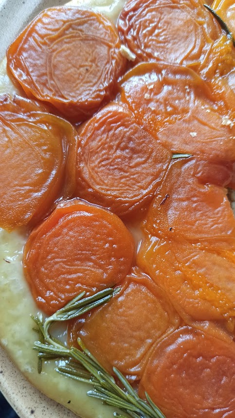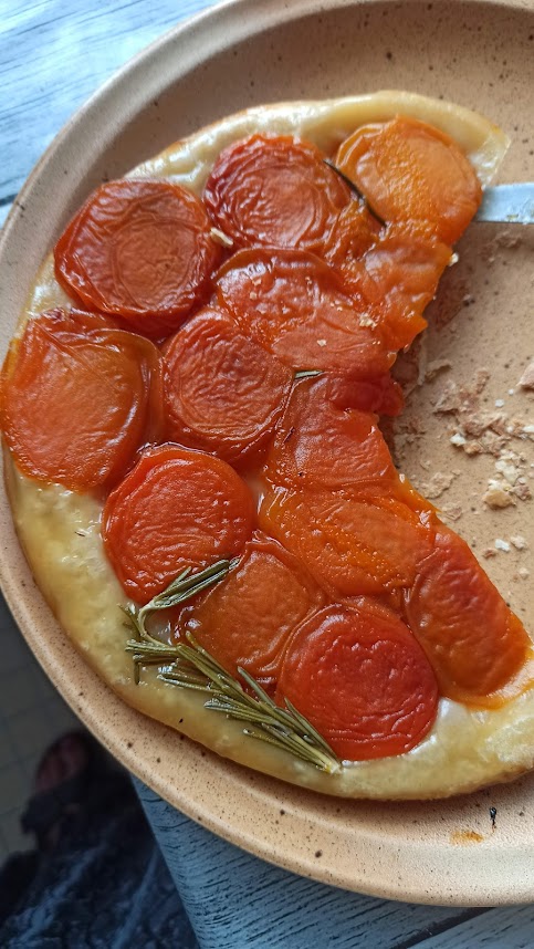 Laver et dénoyautées les abricots . Dans une grande poêle verser 50 g de sucre , 2 cuillères à soupe de miel et 30ml d’eau. Porter à ébullition jusqu’à ce que le mélange commence à caraméliser . Ajouter une branche de romarin ainsi que les demis abricots face coupée vers la poêle , laisser mijoter 5 minutes à feu doux. Déposer régulièrement les abricots faces bombées vers le moule verser le caramel . Recouvrir d’une pâte brisée faite maison où acheter. Enfourner dans un four à 180 ° pendant 30 minutes selon le four. À la fin de la cuisson démouler immédiatement sur un plat de service . Servir frais.