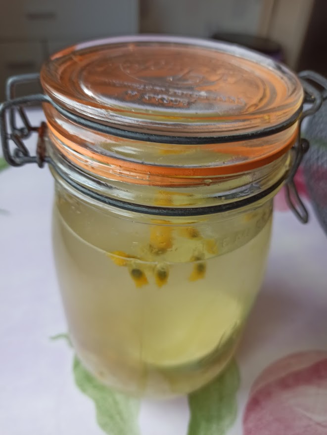 Dans un bocal hermétique verser 20 g de graines de kéfir , 20 g d’infusion de fruits , 40 g de sucre , 1 rondelle de citron ajouter de l’eau . Fermer le bocal laissé 2 ou 3 jours. Au bout de ce temps prendre une bouteille hermétique et mettre un entonnoir et un chinois y verser le kéfir en enlevant l’infusion de fruits et la rondelle de citron. Rincer le kéfir et recommencer. Fermer la bouteille la laisser 24 heures à température ambiante puis se conserve au moins 6 jours au frigo.