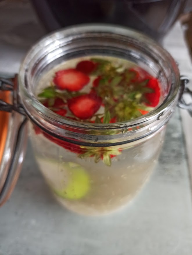Dans un bocal 1 l mettre des queues de fraises ainsi que 2-3 fraises, 20 g de graines de kéfir, 20 g de sucre, 1 rondelle de citron vert, 1 figue, ajouter l’eau . Fermer le bocal hermétiquement. Laisser 24 heures ou lorsque la figue est remontée. Passer la boisson et faire comme ici .