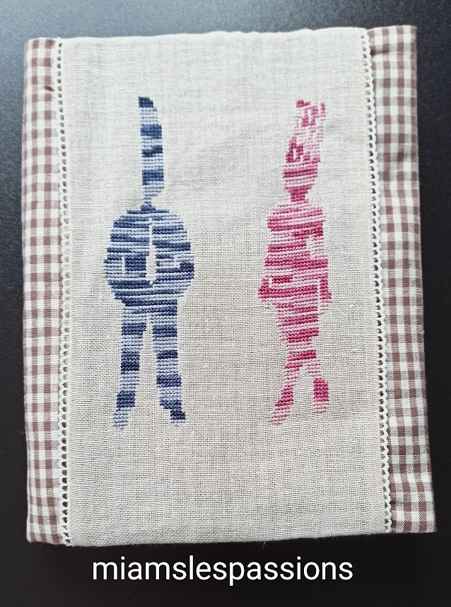 J’ai réalisé cette couverture pour mon cahier de recettes . Réaliser à la broderie , couteau homme, fourchette femme