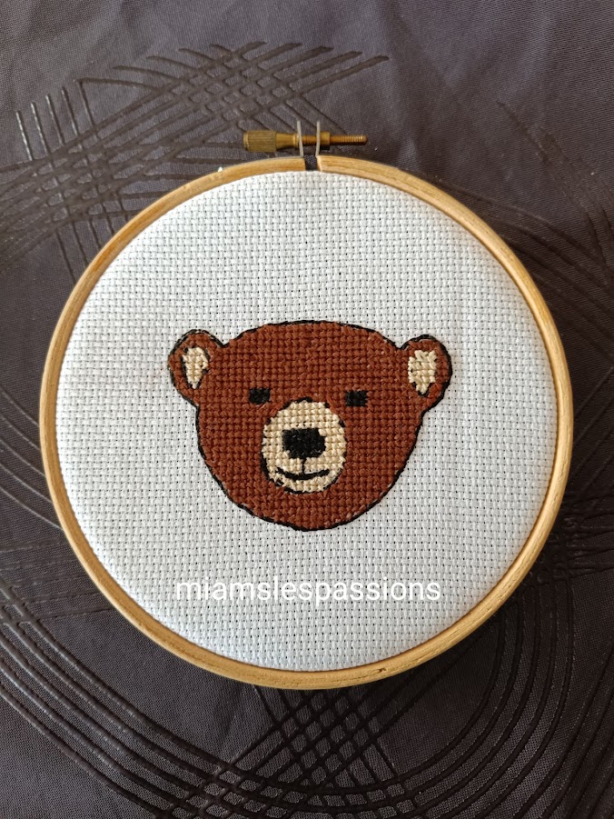 Petite broderie d’un ourson pour décorer la chambre d’un enfant.