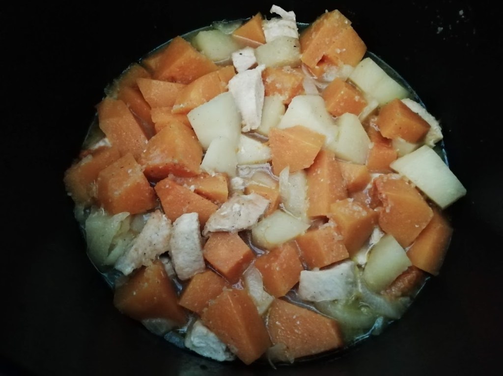 Dans la cuve du Cookéo mettre 2 c à s d’huile d’olive , des morceaux d’escalope de poulet et 1oignon émincé. Programmer en mode doré. À la sonnerie ajouter de la butternut épluchées et coupées en morceaux , des pommes de terre, 200 ml de bouillon de légumes ici . Mettre l’appareil en mode cuisson rapide pendant 10 minutes à la sonnerie c’est prêt. Servir.