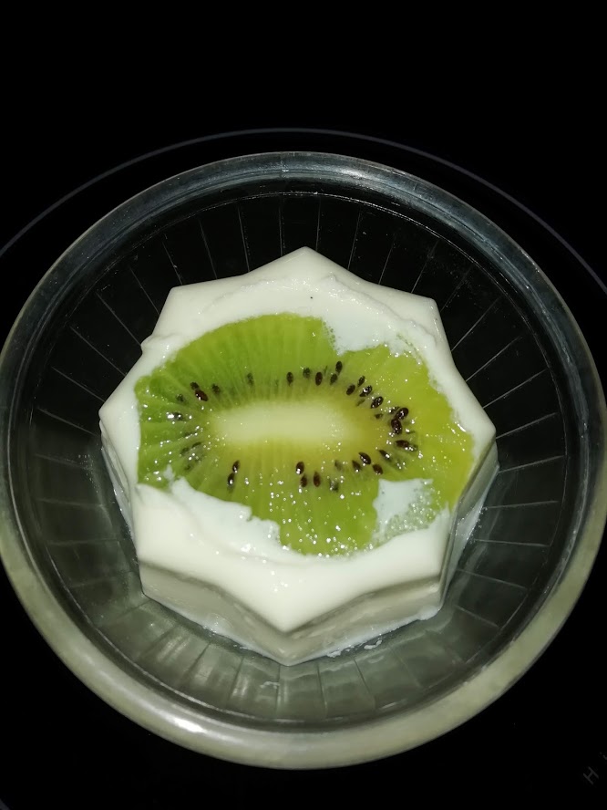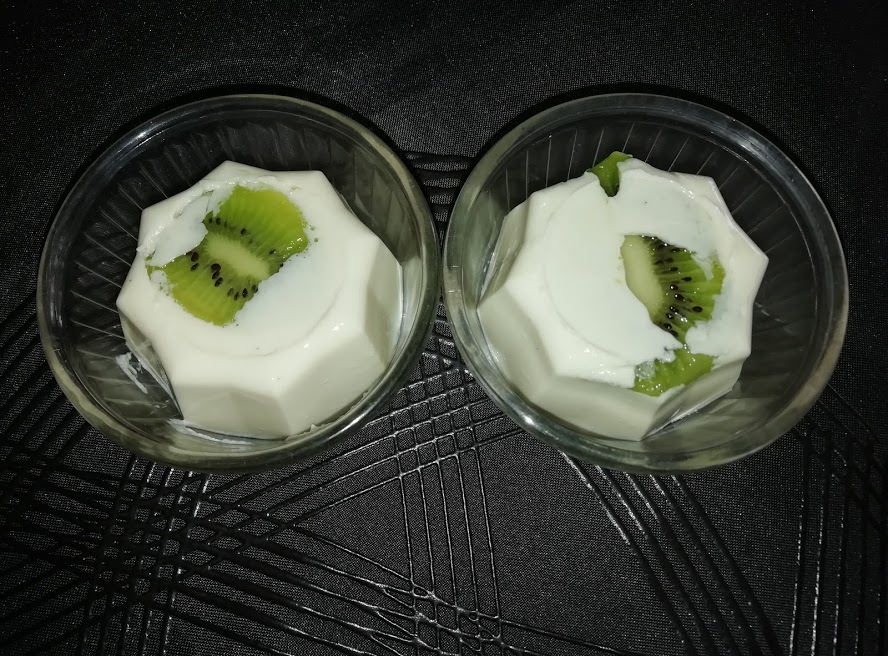 Dans le bol du Thermomix 5 verser 300 g de crème liquide, 150 g de lait demi-écrémé, 100 g de chocolat blanc, quelques gouttes d’extrait de vanille. Programmer l’appareil 6 min / 90°/ vit 2 . A la sonnerie ajouter 2 g d’agar-agar et continuer la cuisson 2 min / 90° / vit 2. Dans des verrines mettre au fond une rondelle de kiwi puis verser la crème dessus mettre au frais 2 h minimum .