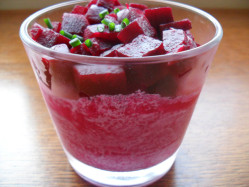 Verser dans des verrines par dessus ajouter des dès de betteraves et de la ciboulette ciselée.