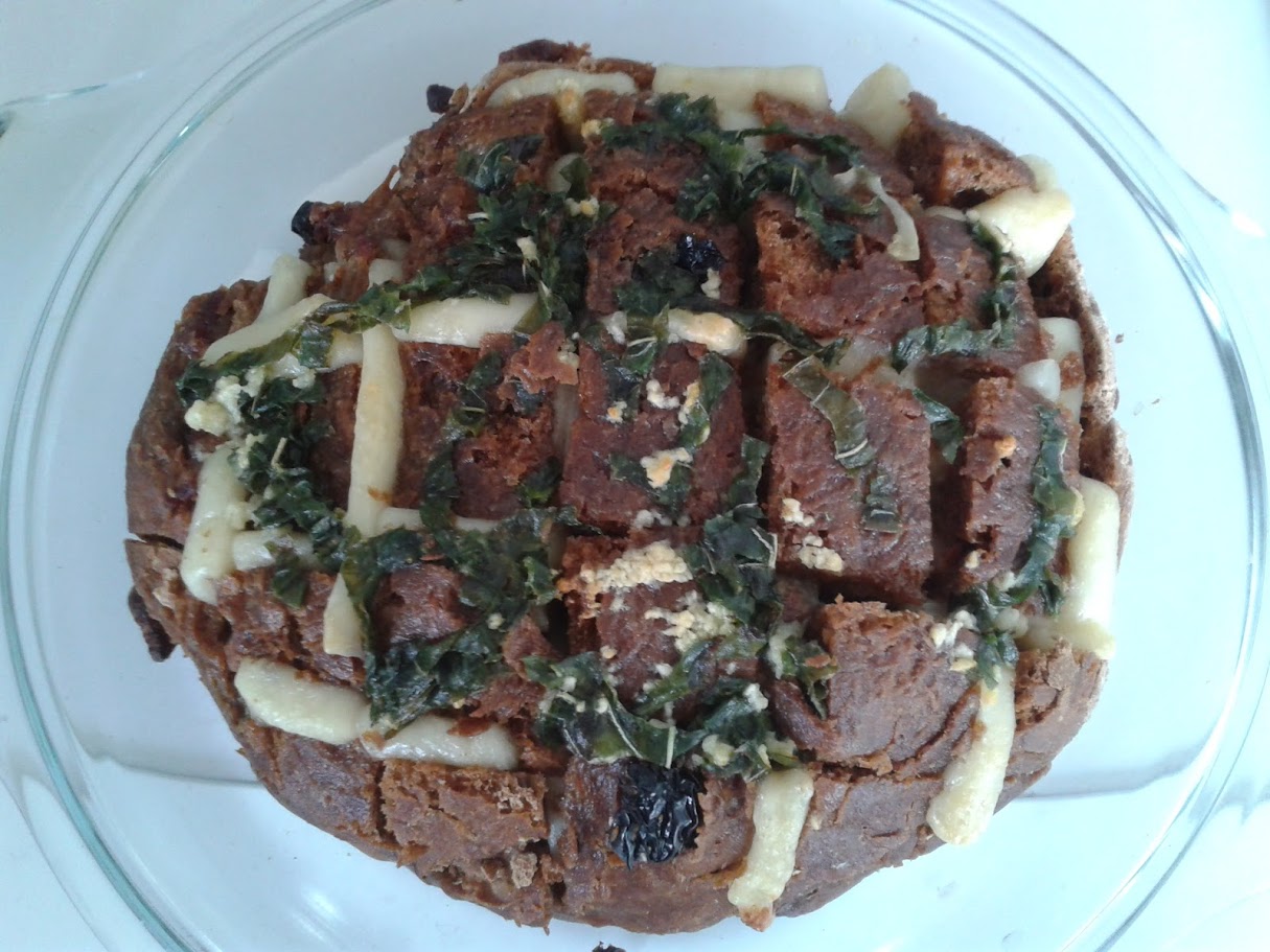 et en ajoutant à la pâte des morceaux de tomates séchées .Laisser refroidir ce pain . Couper la boule de pain en tranches sans toucher la base. Faites la même chose dans l’autre sens de manière à obtenir des carrés de pain.Coupez des tranches fines de gruyère et disposer les morceaux dans les interstices du pain.Faites fondre du beurre (quelques secondes au micro-ondes en mode décongélation) et ajoutez-y du basilic, de l’ail pilé et un peu de sel. Verser ce mélange sur le pain . Passer à four chaud 180° pendant 10 à 15 min.