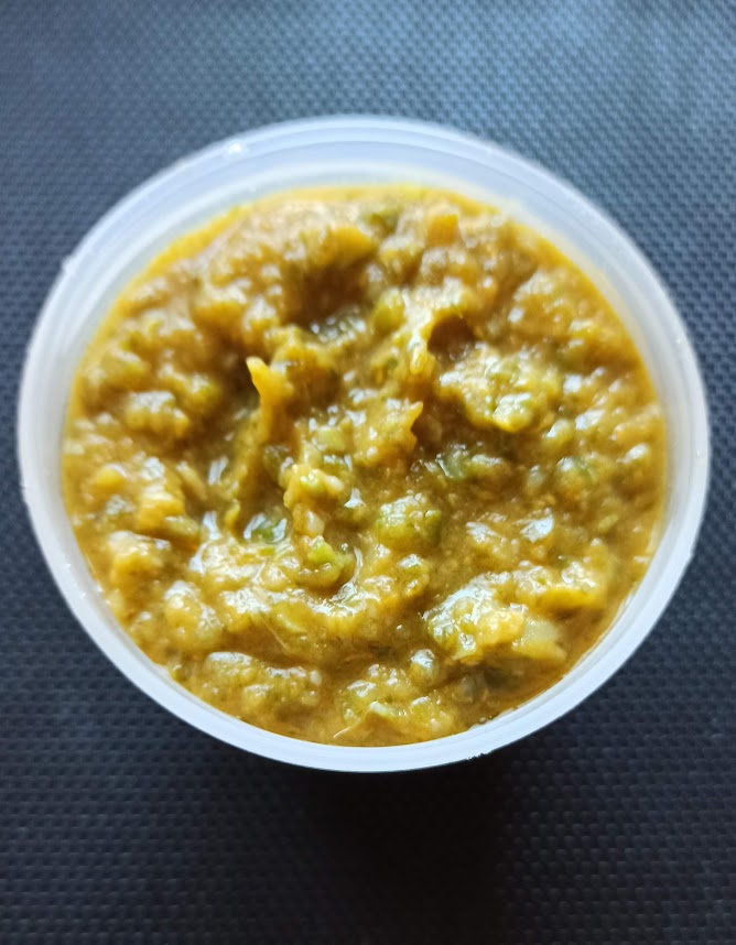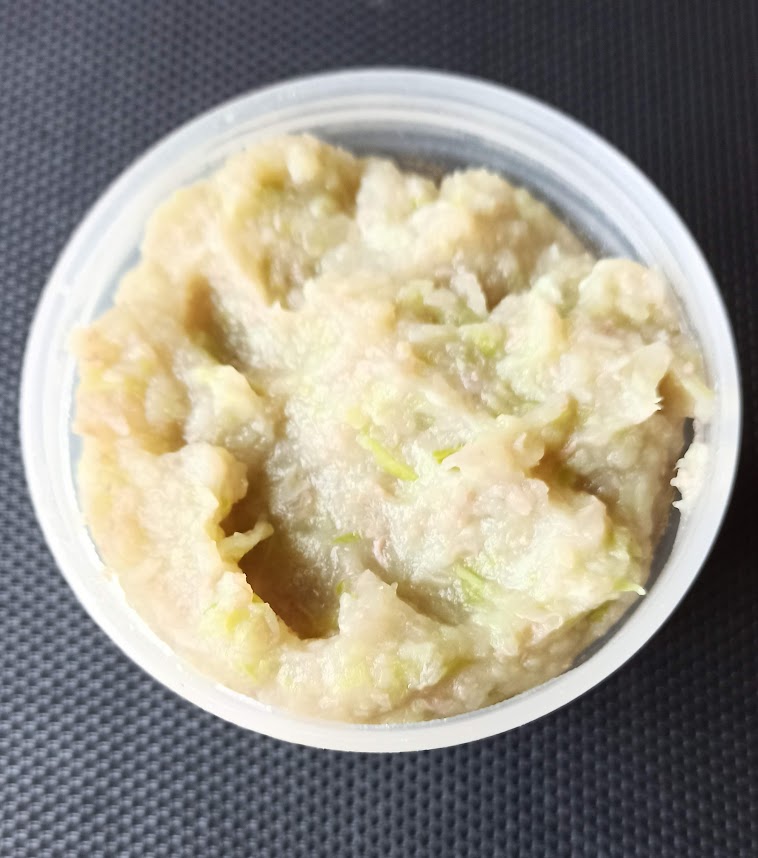 Dans le bol du Thermomix mettre 3 poignées d’haricots verts ,1 panais , la moitié d’une patate douce et 2 gobelets d’eau . Programmer l’appareil 15 min/ varoma /vit 2. À la sonnerie ajouter un petit morceau d’escalope de veau. Mixer vitesse 8 pendant 8 secondes racler les bords du bol et recommencer si nécessaire.
