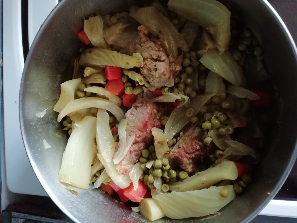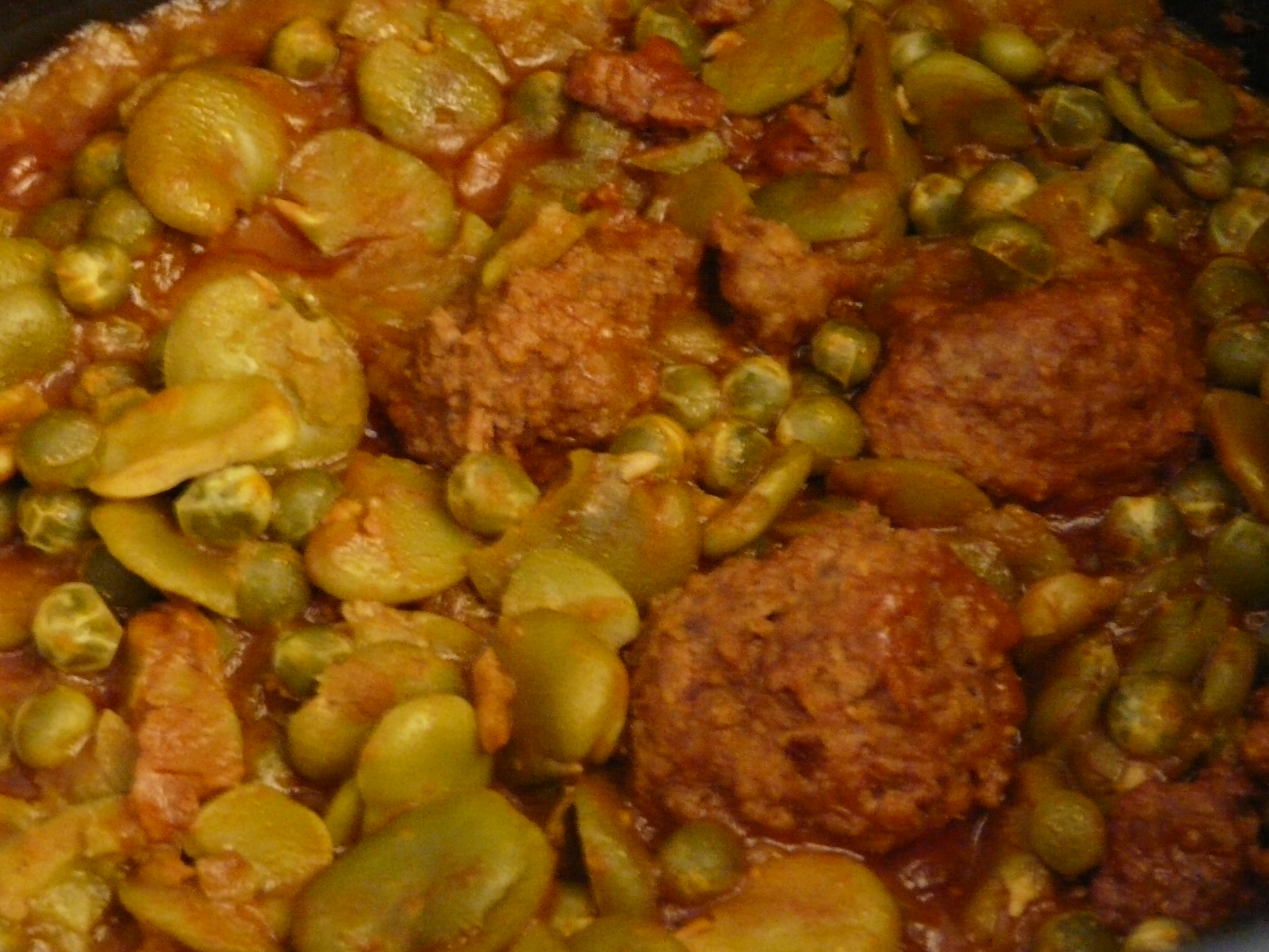 Dans un wok verser un filet d’huile d’olive et faire revenir 1 oignon rouge émincé. Ajoutez 1/2 verre d’eau , 2 gousses d’ail , 1c à c de paprika , 1 c à c de curcuma , 1 c à c de cumin , de la coriandre et du persil haché . Bien mélanger et laissez mijoter quelques minutes. Puis mettre les petits pois et les fèves ( pour moi viennent du jardin) , mélanger recouvrir d’eau , couvrir le wok et laisser mijoter 20 minutes . Au bout des 20 minutes ajoutez les boulettes de bœuf et laissez mijoter 10 minutes environ . Servir.