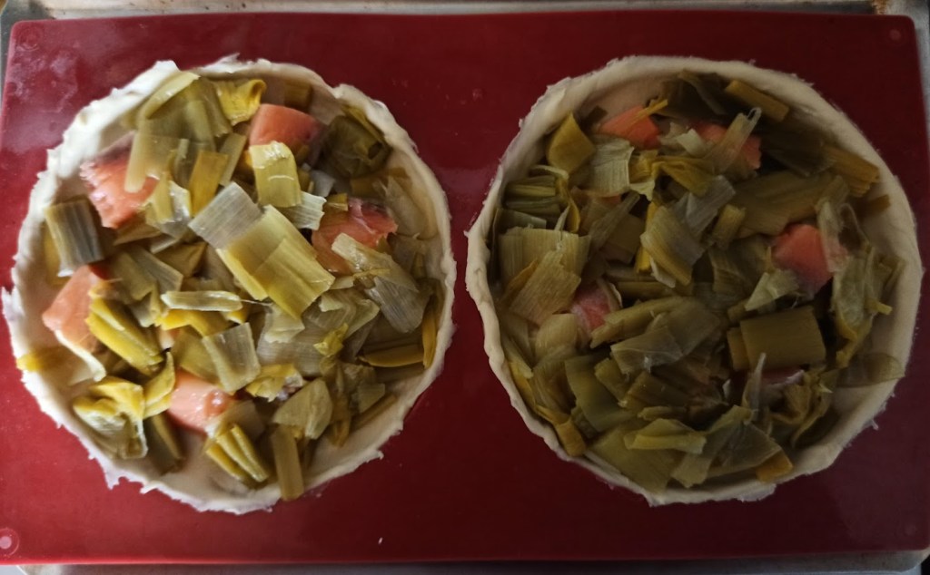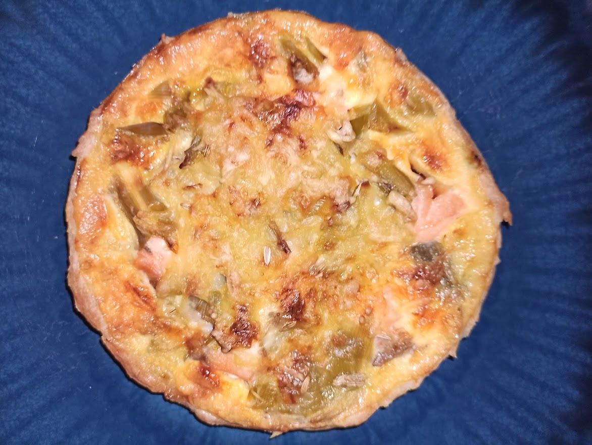 Abaisser une pâte feuilletée dans un moule à tarte. Mettre dans le fond de tarte des morceaux de saumon frais cru coupée en dés ainsi que du poireau déjà cuit coupé en morceaux. Dans un saladier mélanger 3oeufs , 10 cl de crème fraîche, 50 ml de lait , sel , poivre et des graines de fenouil . Verser cette préparation sur le saumon et poireaux , parsemer de gruyère râpé . Enfourner à four chaud 180° pendant 20 minutes . À la fin de la cuisson servir avec une salade.