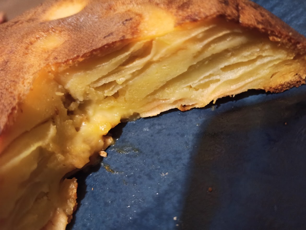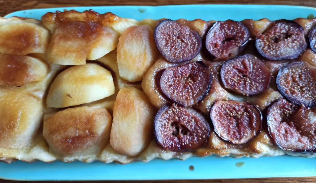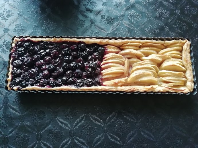 Abaisser une pâte feuilletée dans un moule à tarte rectangulaire. Éplucher et couper des pommes en lamelles que l’on met d’un côté de la tarte et de l’autre côté mettre des myrtilles . Enfourner dans un four chaud à 180° pendant 20 minutes.