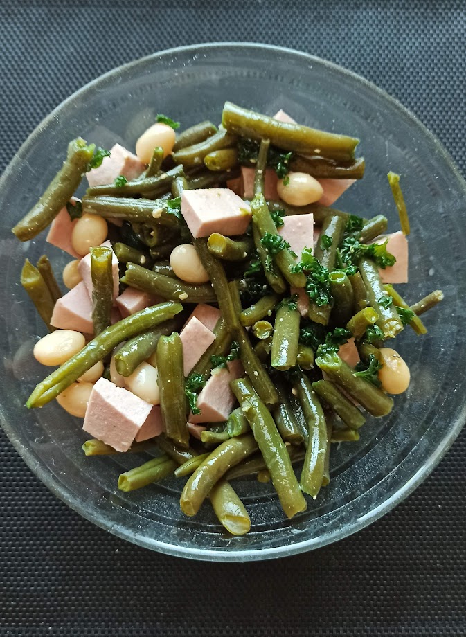 Dans un saladier mettre des haricots verts et des haricots coco frais cuit à l’avance, des morceaux de cervelas, du persil, oignon, sel poivre et une vinaigrette à votre goût.
