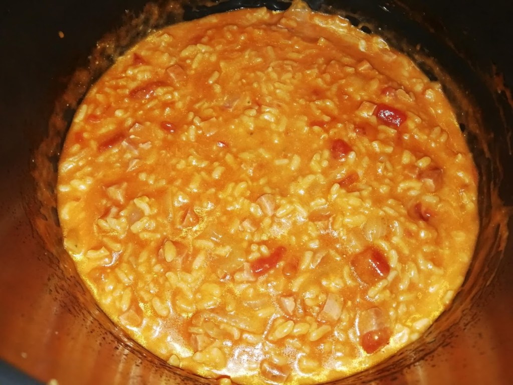 Mettre le cookeo en mode dorer. Faites dorer pendant 5 minutes dans 2 c à s d’huile d’olive , un oignon émincé , 200 g de riz arborio, 400 ml de bouillon de légumes ici, 1 petite boîte de concentré de tomate , 2 tomates fraîches couper en morceaux ,des dés de jambon , sel . Fermer l’appareil et cuire sous pression pendant 10 minutes. À la sonnerie servir .