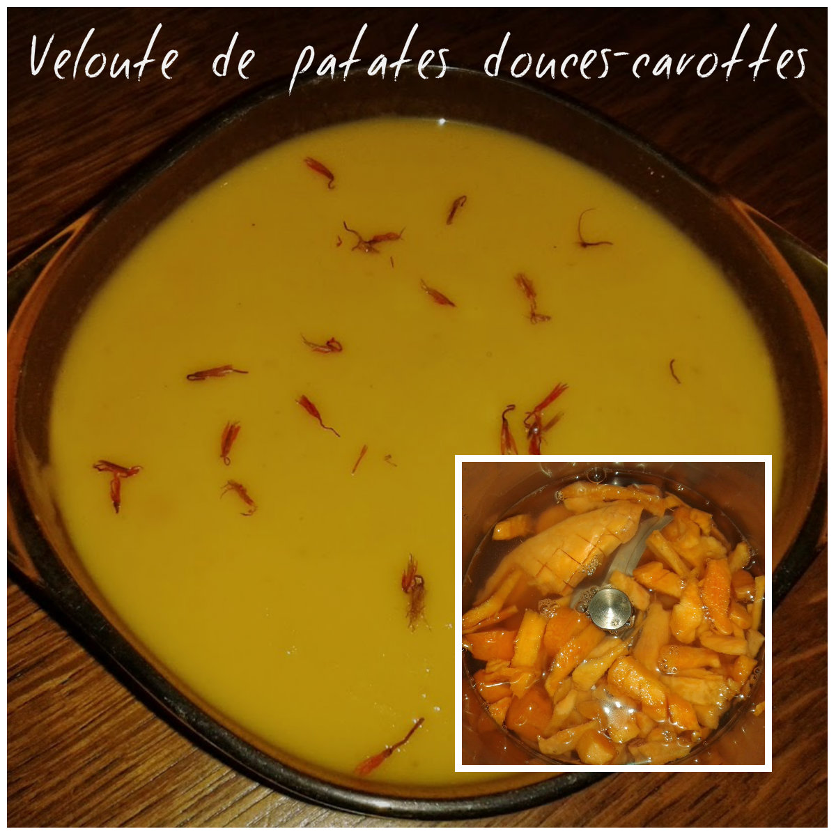 Éplucher et couper une patate douce et des carottes ,recouvrir d’eau .Programmer 90° vit 2 pendant 20 mn .Mettre 1 mn de turbo .Servir dans des bols et ajouter quelques pistils de safran.
